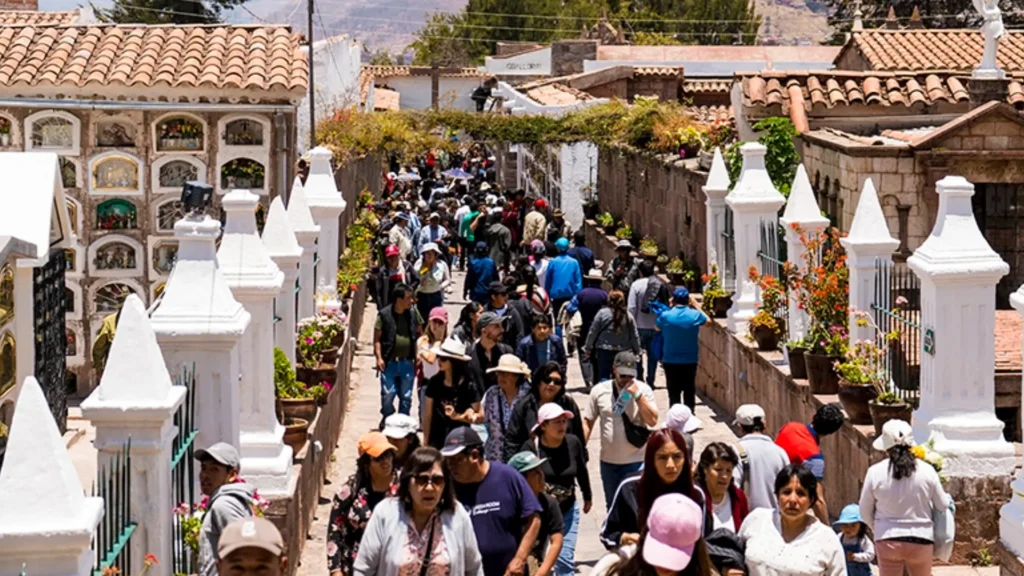 El dos de noviembre, conocido como el Día de los Muertos o Día de los Fieles Difuntos, se vive con profundo respeto y amor. Desde temprano, las familias cusqueñas se dirigen a los cementerios, especialmente al histórico Cementerio de la Almudena, para limpiar, adornar y cuidar las tumbas de sus seres queridos. Se colocan flores frescas, velas encendidas y panes decorados. Es común ver familias completas compartiendo alrededor de las tumbas, llevando alimentos, bebidas y música. Algunas personas contratan músicos que interpretan huaynos o canciones que les recuerdan momentos felices junto al difunto. De esta manera, el silencio del camposanto se llena de vida, risas y nostalgia.